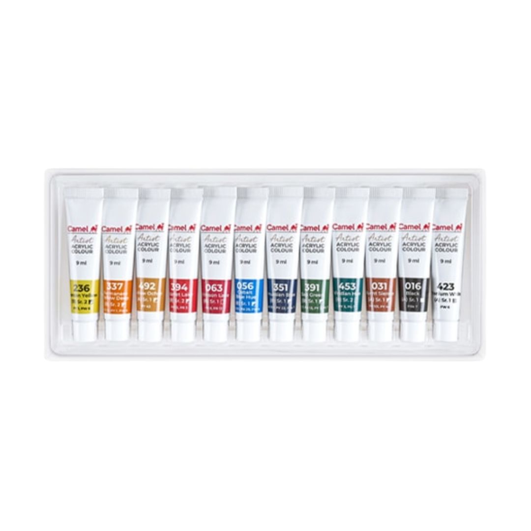 Camel Artist Acrylic Colours – Pack of 12 (9ml each) is a versatile, high-performance acrylic paint set designed for both beginners and experienced artists. This compact yet vibrant set is perfect for spontaneous artwork, school projects, or fine art.