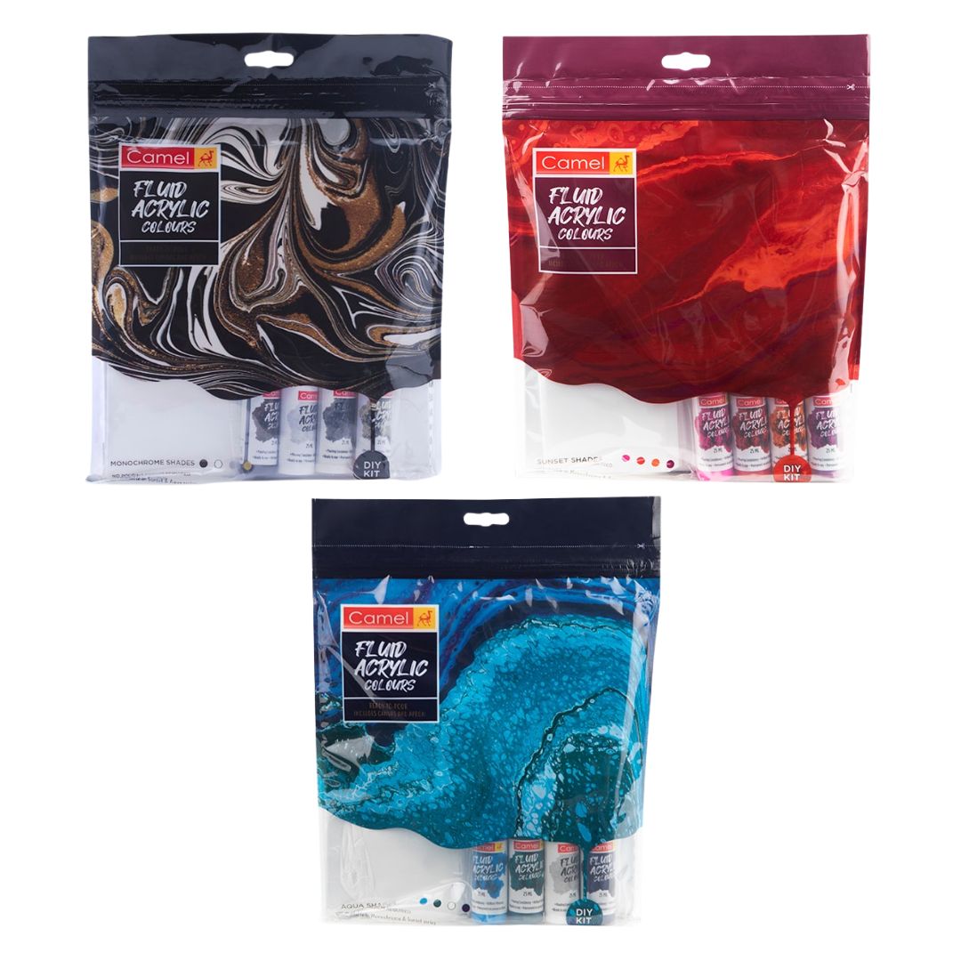 The Camel Fluid Acrylic Colours Kits offer everything you need to create stunning, vibrant artwork with ease. Available in three vibrant series—Sunset Series, Aqua Series, and Monochrome Series—each kit comes with carefully selected colours to evoke a specific theme. The fluid acrylic paints are easy to apply and require no additional art materials, making them ideal for beginners and professional artists alike.