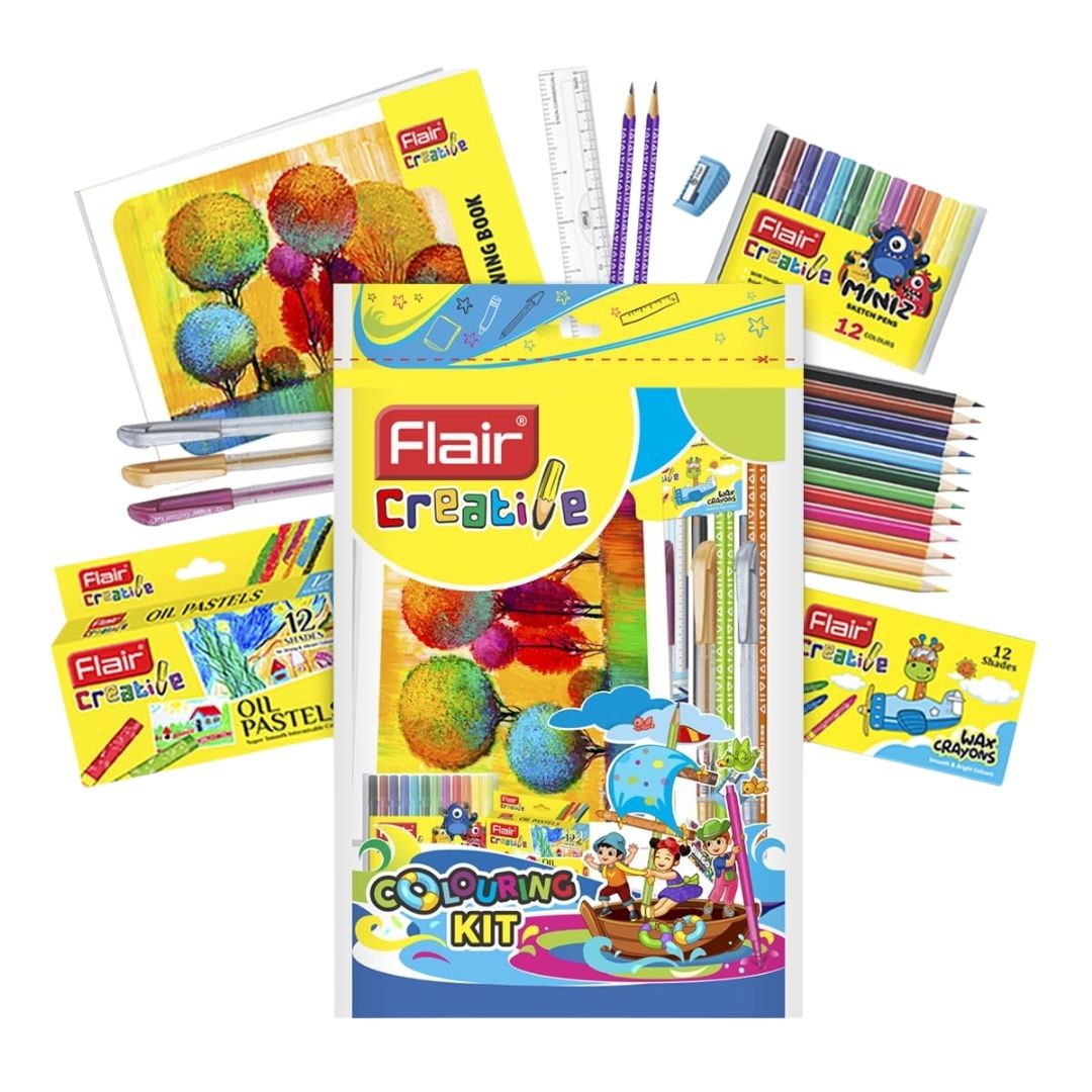 Spark artistic joy with the Flair Creative Colouring Kit! This perfect gift includes a drawing book, wooden pencils, wax crayons, oil pastels, glitter pens, Miniz sketch pens, mini colour pencils, a plastic scale, sharpener, eraser, and Hotline fineliner pens.