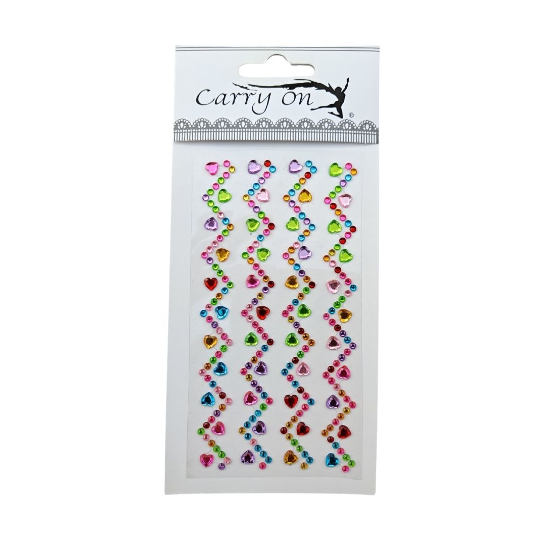 The Multicoloured Self-Adhesive Stones – Zig Zag with Hearts offer a unique mix of colorful zig zag and heart-shaped stones with strong self-adhesive backing suitable for paper, plastic, wood, skin, nails, and other surfaces.