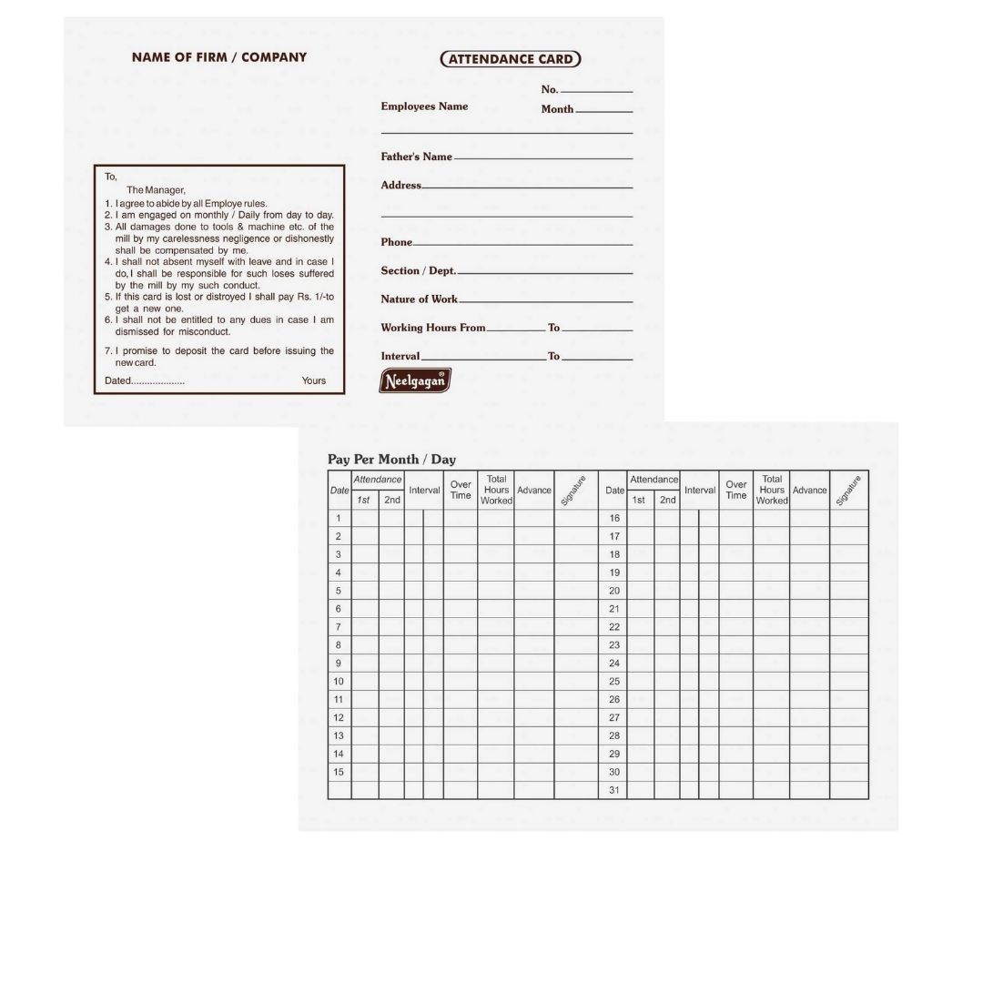 Introducing our Neelgagan Attendance Card, the perfect solution for keeping precise track of your employees’ attendance in your factory or large company. These compact cards come in a convenient pack of 100 and are sized at 11cm x 17cm, making them incredibly easy to store and transport within any office or factory setting. Available in a classic black finish (also available in brown), they offer a professional look that seamlessly blends with your workspace. Each durable card provides ample space to record a full day’s attendance for one employee, with clear, designated sections for marking attendance, absence, late arrival, and early departure. This structured format makes it effortless to track attendance patterns, monitor employee performance, and streamline your HR processes. Say goodbye to the complexities of traditional paper-based systems and switch to the Neelgagan Attendance Card for a simple, reliable, and accurate attendance tracking solution.