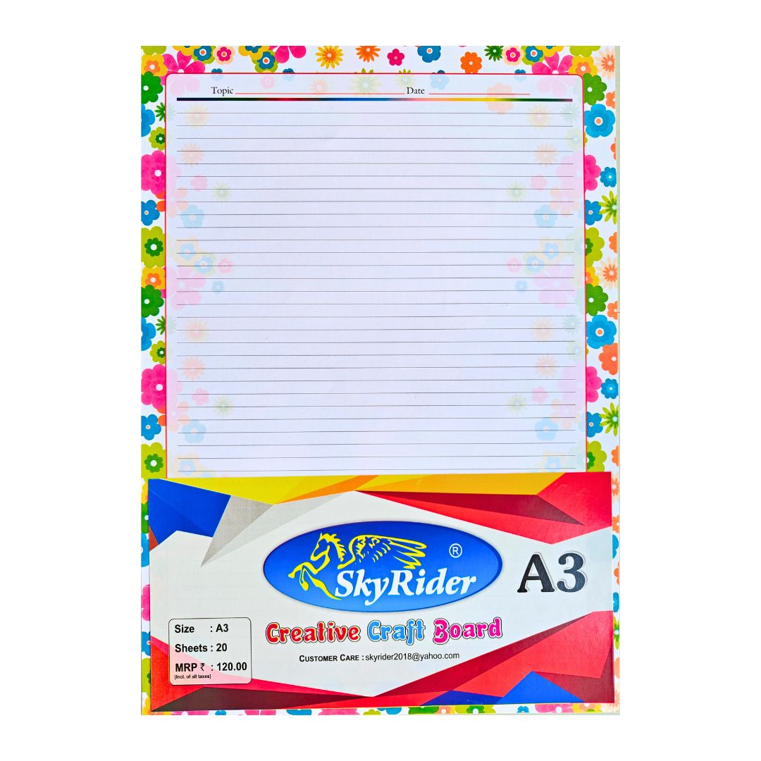 Sky Rider A3 Vertical File Paper (20 Sheets) features vibrant designer prints and decorative borders on one-side ruled sheets. Perfect for students and professionals, these sheets provide a structured side for neat writing and a blank reverse for creative work, ideal for academic files, creative journaling, and formal presentations.